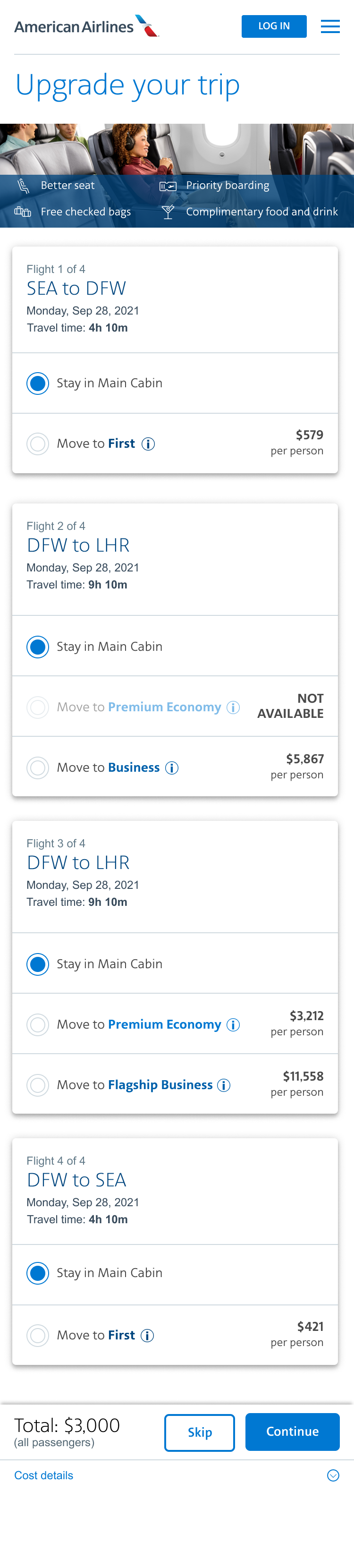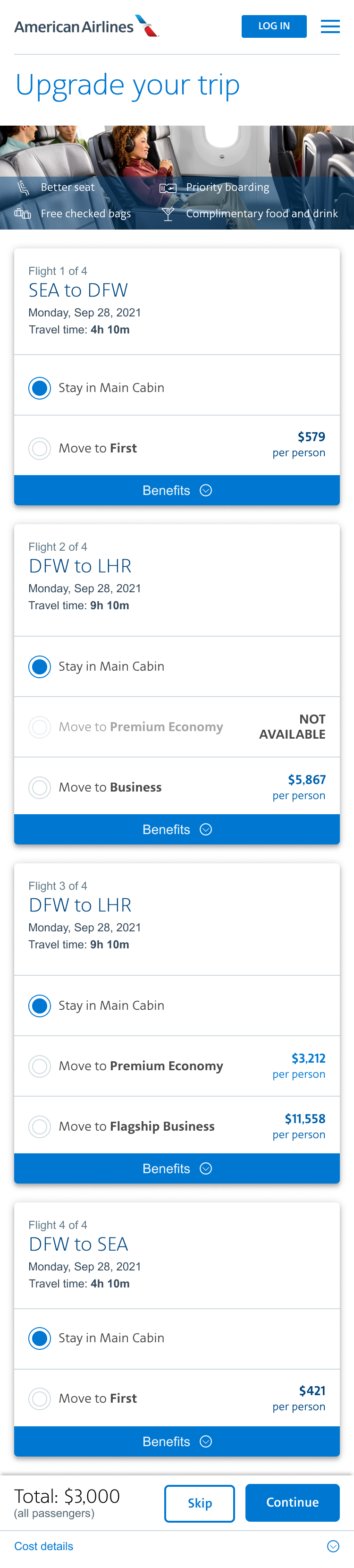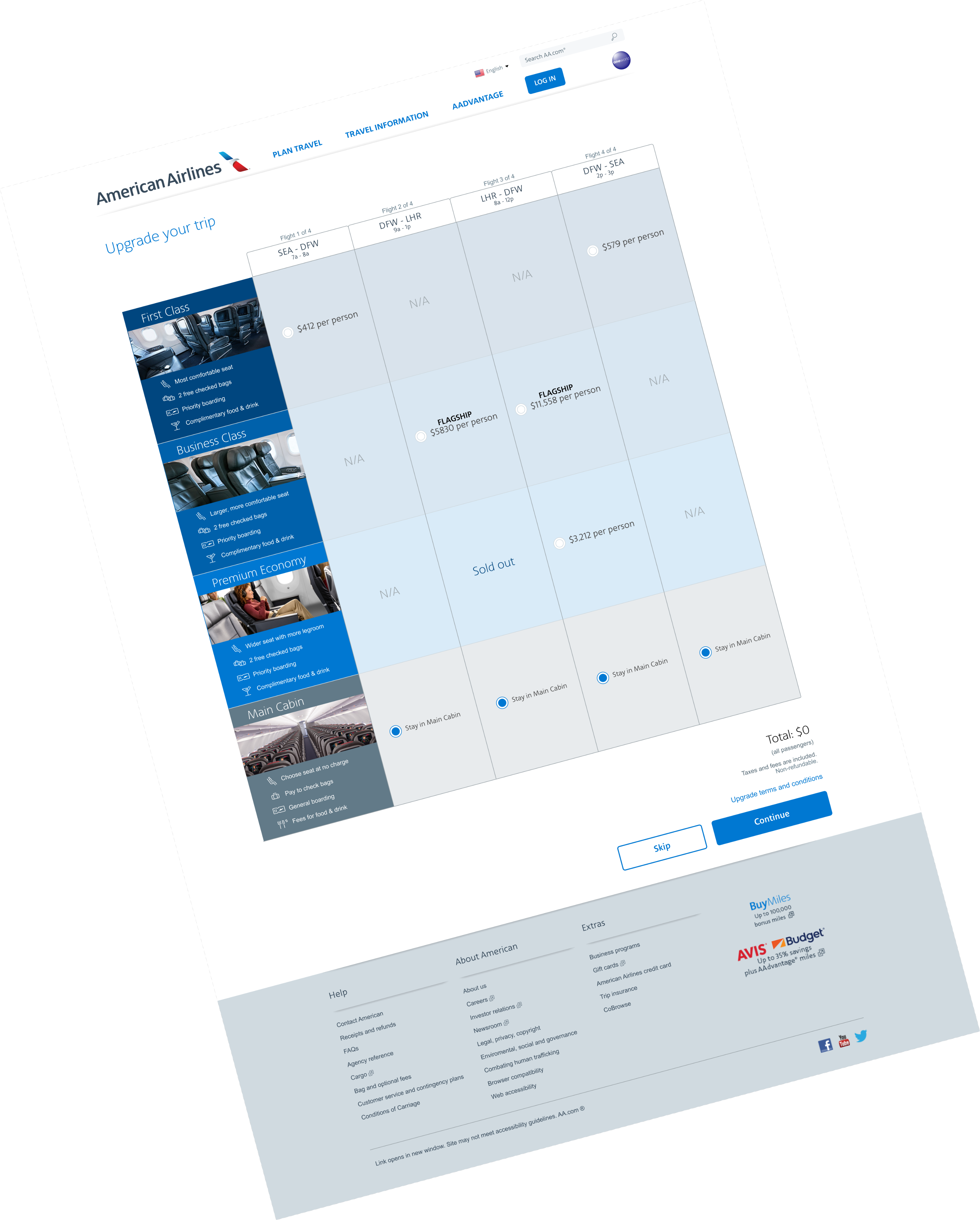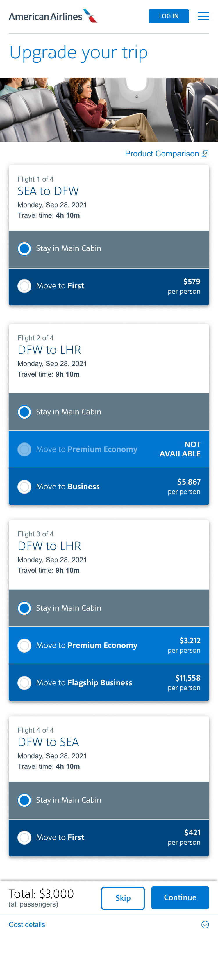 Solution: Design a page that will offer customers the flexibility to choose upgraded seats for each leg of the flight